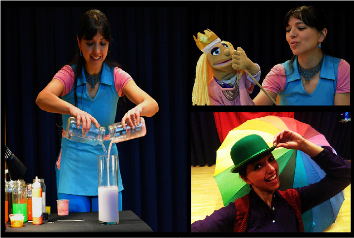 • «Somos iguales». En este espectáculo de cuentacuentos con títeres incluyo tres cuentos: uno en el que se explica por qué el morado es el color de la igualdad, en el que llevo frascos con líquidos de colores que luego mezclo (muy visual) y tiene un texto ligero y fresco. También el cuento «Ser princesa y rosa es aburrido» con títere de guante. Y por último la historia de «Arturo y Clementina» que va con teatro de sombras.